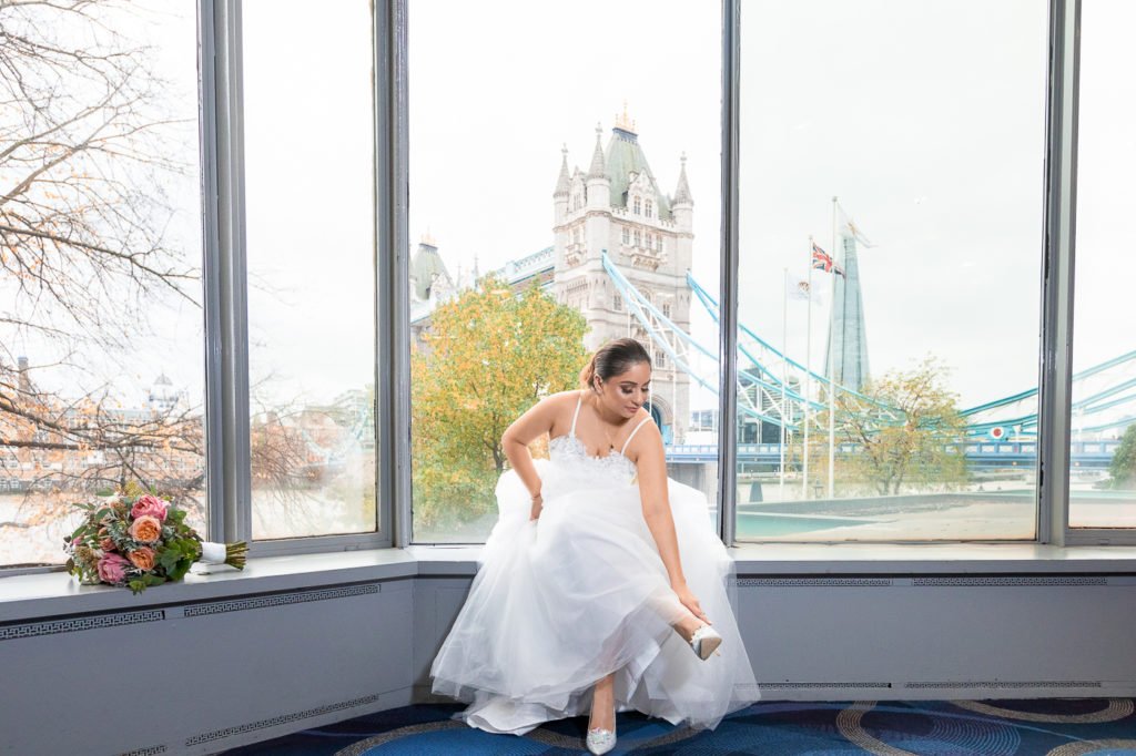 Occasionally, we receive enquiries from couples who do not want a traditional wedding or they want a white wedding vow renewal. Yes, of course we are more than happy to help. Like this wedding, we have provided wedding photography service for a friendly British Indian bride and groom at The Tower Hotel, a 3-min walk from Tower Bridge, London, UK.